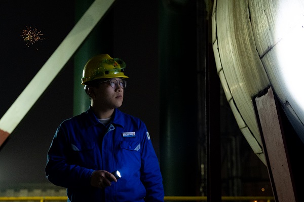 遠(yuǎn)處夜色籠罩下的城市,在節(jié)日煙花的映襯下,流光溢彩,分外迷人。又是一年萬家燈火時,又是一年闔家團(tuán)圓日。今晚的夜色格外美麗,卻讓人無心去欣賞,化工人背后的那份溫暖與感動讓人們的心久久難以平靜。裝置區(qū)機(jī)器的隆隆聲依舊,有機(jī)器運(yùn)轉(zhuǎn)的地方就會有巡查人員忙碌的身影,他就是雙甲車間合成崗位的劉超,此刻的他像極了默默付出的幕后英雄,用執(zhí)著與敬業(yè)為設(shè)備的安全運(yùn)行保駕護(hù)航。