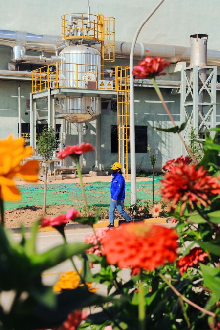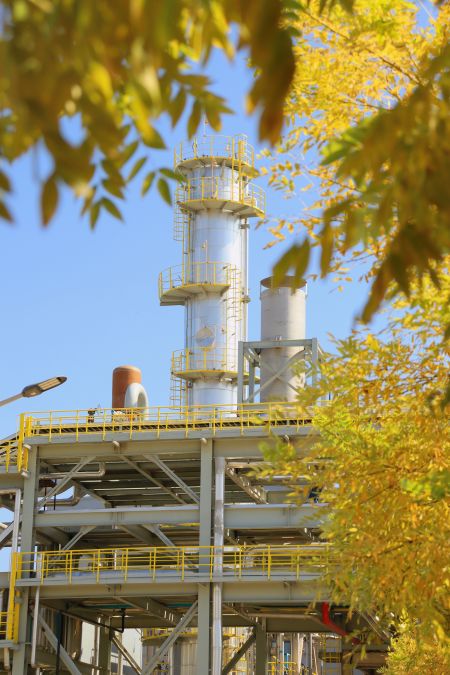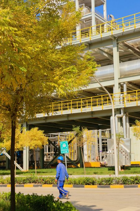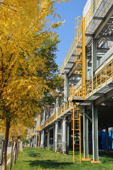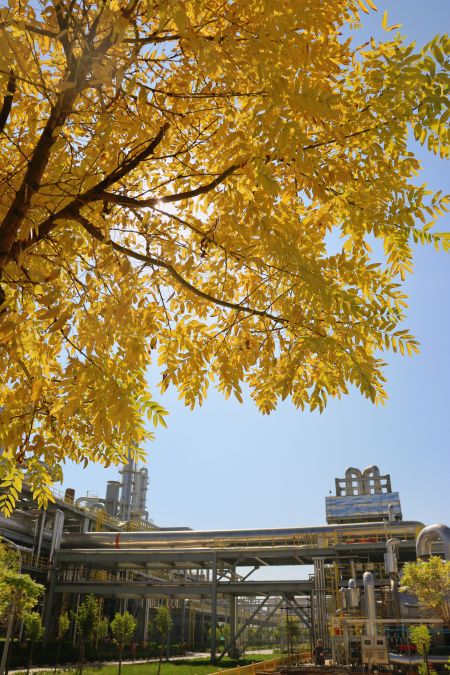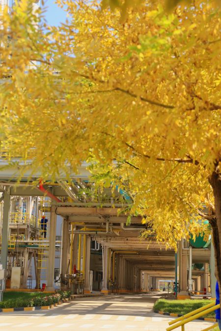 “萬美之中秋為最”,秋不止在山村田野間路過,還停留在新民塬工業(yè)園區(qū)的每一處不起眼的角落里。漸漸泛黃的樹葉與銀白色的精餾塔形成鮮明的比照,愈發(fā)凸顯出藏在工業(yè)建筑里獨(dú)特的秋色;陽光從金黃的樹隙間透過,散發(fā)著耀眼的光芒;道路兩旁,幾株不知名的野花努力地挽留著詩情畫意的秋天;工業(yè)的“高冷”與秋天的“詩情畫意”在這片土地上實(shí)現(xiàn)完美的交融,這便是藏在彬州化工里的秋色。