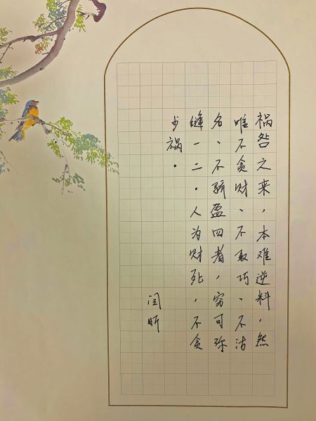 大家寫出了各自的廉潔名言警句、詩詞語錄,一張張蒼勁有力的書法作品、一句句發(fā)人深省的廉政格言警句,立意深刻、筆法勁道、令人深思,令人警醒,大家通過閱讀、領悟、摘錄的過程,進一步筑牢了拒腐防變的思想道德防線,增強了黨性意識、廉潔意識、紀律意識、家風意識,加強了廉政文化建設,讓黨風廉政教育深入人心,發(fā)揮了廉政文化的引領作用。